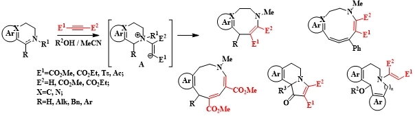 We have developed methods for synthesizing annelated nitrogen-containing rings of medium size, specifically 5- and 6-membered rings, which incorporate pharmacophore groups [1-4]. These methods utilize electron-deficient alkynes and alkenes and are based on domino and multicomponent reactions. Many of the resulting compounds demonstrate significant bioactivity.